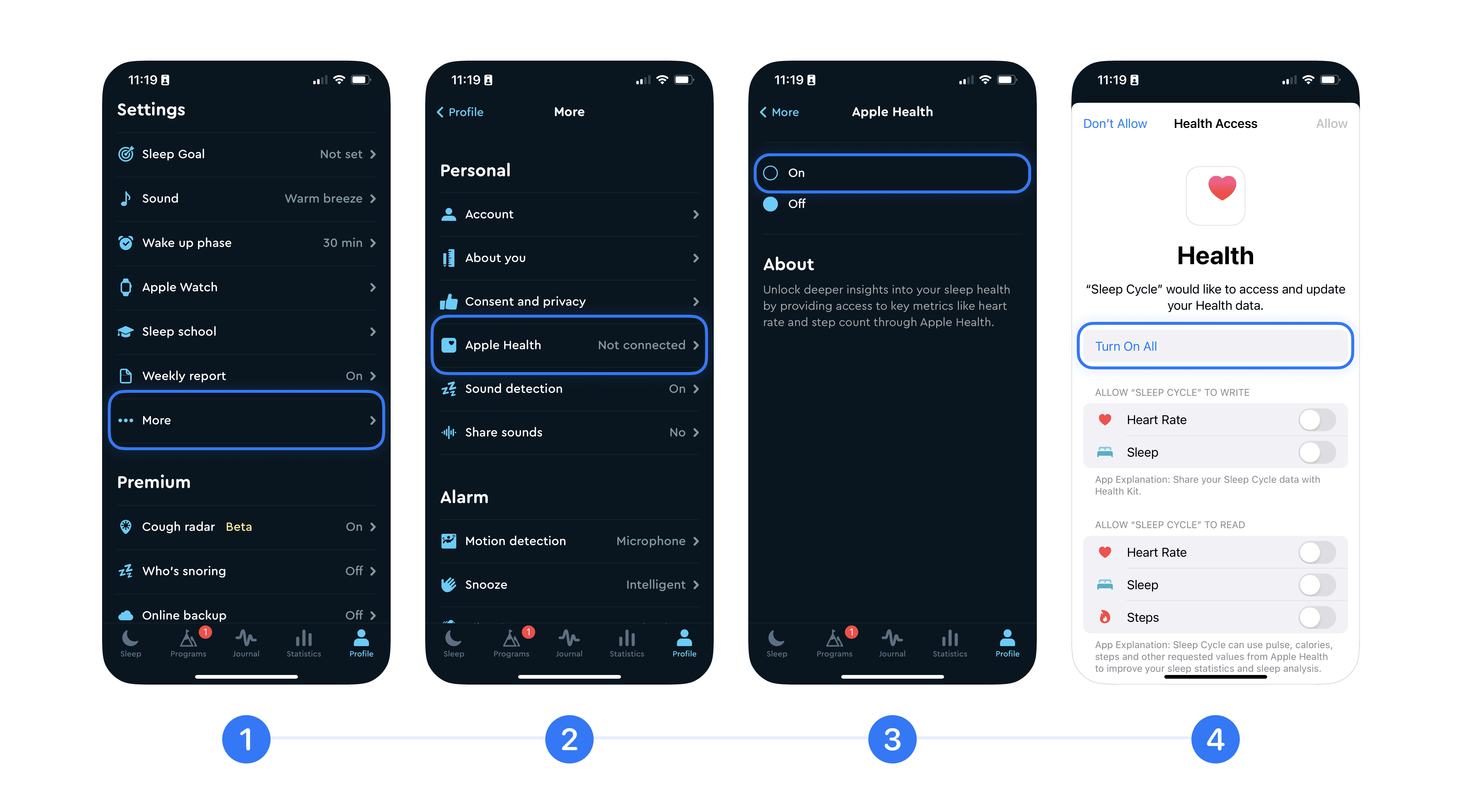 Integrating Sleep Cycle with Peaks enhances your ability to monitor and analyze your sleep patterns. Here's how you can connect Sleep Cycle to Apple Health, which in turn syncs with Peaks.